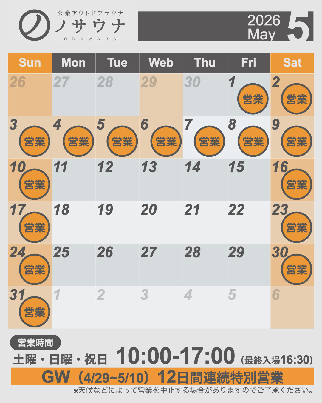 2026年5月は土日祝日営業に加えてGW特別営業として4/29〜5/10まで12日間連続営業いたします。
